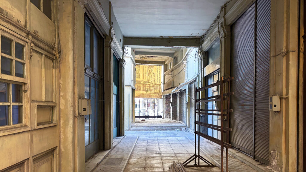 Αφήνοντας πίσω τα χάνια, η πόλη ξετυλίγει τις στοές της — μυστικά περάσματα που κάποτε αποτελούσαν την καρδιά του εμπορίου. Η Στοά Αγίου Μηνά ανεγέρθηκε το 1906 και, σε σχήμα Τ, συνδέεται με τον Ιερό Ναό Αγίου Μηνά.