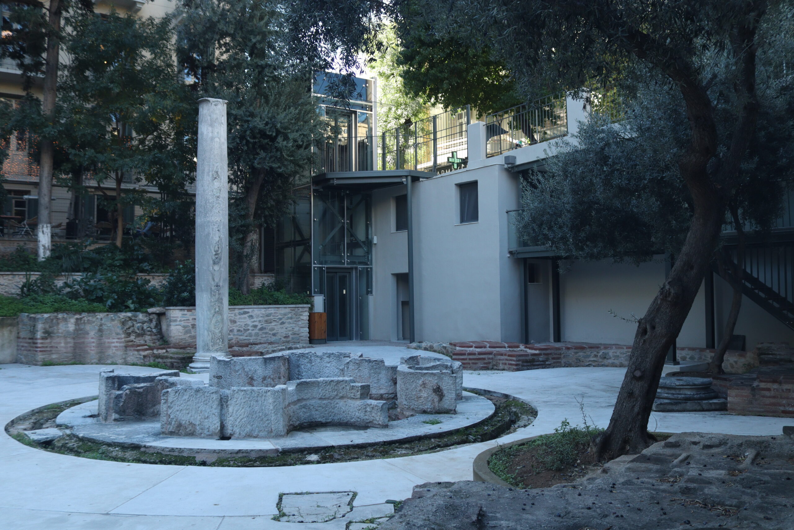 Στον προαύλιο χώρο του ναού διακρίνονται ερείπια μιας δημόσιας κρήνης και λουτρών της ρωμαϊκής εποχής. Η κρήνη, αφιερωμένη στις Νύμφες, είναι γνωστή και με το όνομα Νυμφαίον. Οι ιστορίες για μια «υπόγεια Θεσσαλονίκη» που απλώνεται κάτω από τα πόδια μας γεννήθηκαν από τις στοές που αποκαλύφθηκαν σε έργα ανοικοδόμησης και θεμελιώσεων, ενώ τα διάσπαρτα τμήματα κρυπτών, κατακομβών και παλιών καταπακτών συνέβαλαν στην εξάπλωση των θρύλων.