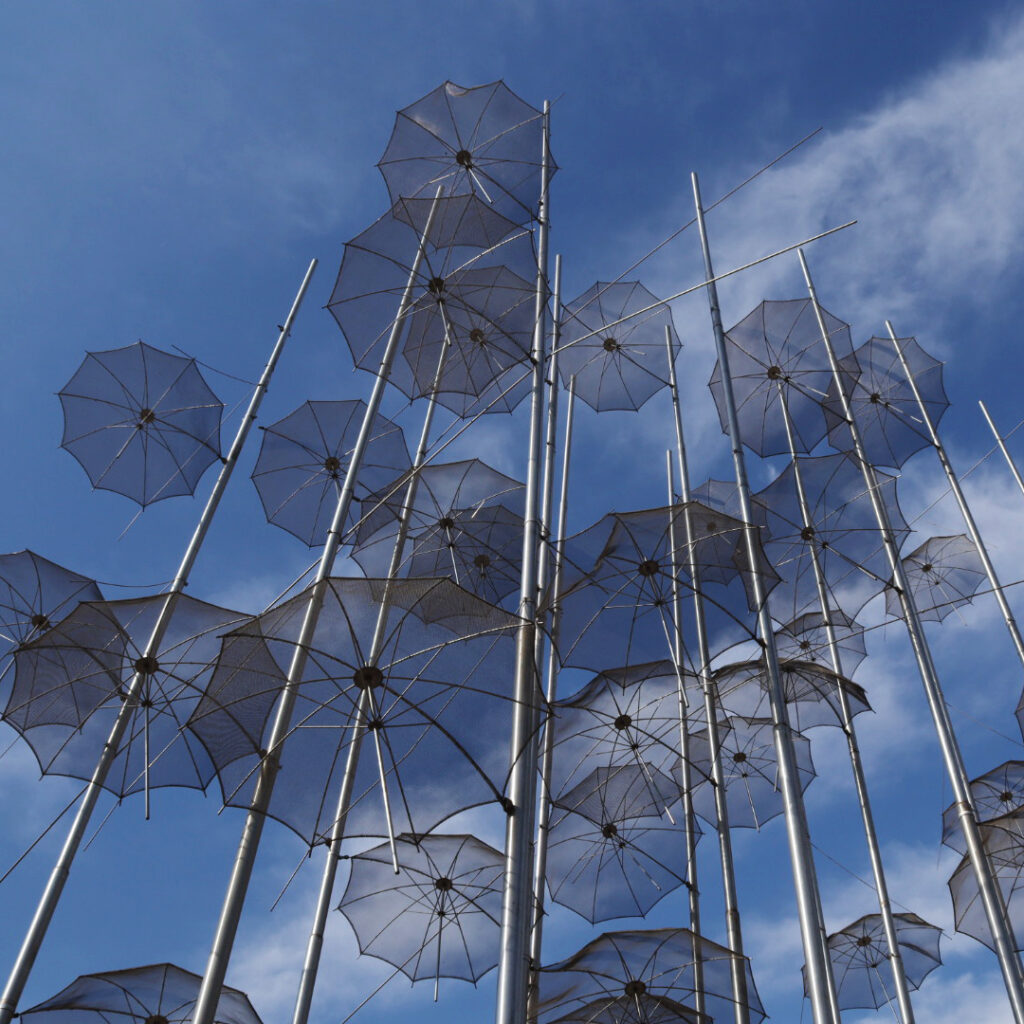 Μπορεί το σήμα κατατεθέν της Θεσσαλονίκης να είναι ο Λευκός Πύργος, όμως οι «Ομπρέλες» που στέκονται απέναντι από το Δημαρχείο κοσμούν τον Θερμαϊκό με φόντο τον Όλυμπο. Το γλυπτό του Γιώργου Ζογγολόπουλου συνοδεύεται από τη δήλωση του καλλιτέχνη: «Η ομπρέλα, ως αντικείμενο προστατευτικό, είναι οικεία σε όλο τον κόσμο. Όλοι βρίσκουμε προστασία και θαλπωρή κάτω από τον ανάλαφρο θόλο της — καταιγίδες, άγριος ήλιος, τρυφερές συναντήσεις. Θα μπορούσαμε να τη θεωρήσουμε αντικείμενο κοινό στη χρήση του και φανταστικό στην τέχνη». Το έργο παρουσιάστηκε αρχικά στην είσοδο της 45ης Μπιενάλε της Βενετίας και μεταφέρθηκε στη Θεσσαλονίκη το 1997, με την ανακήρυξή της ως Πολιτιστικής Πρωτεύουσας της Ευρώπης. Σήμερα αποτελεί ένα από τα σημαντικότερα αξιοθέατα της πόλης και πόλο έλξης για τους επισκέπτες, που φωτογραφίζονται κάτω από τις «Ομπρέλες», υιοθετώντας συχνά την πόζα της «Μαίρης Πόπινς».