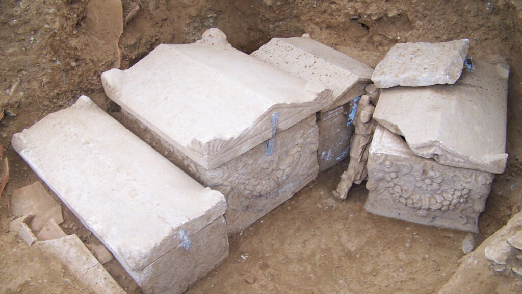 Ξεχωριστή θέση κατείχαν οι μαρμάρινες σαρκοφάγοι, είτε κατασκευασμένες σε τοπικά εργαστήρια είτε εισαγόμενες από σημαντικά κέντρα, όπως η Αττική. Παράλληλα, βωμοί και βωμοειδείς κατασκευές αποτελούν χαρακτηριστικά στοιχεία της ρωμαϊκής ταφικής αρχιτεκτονικής. Προς τα τέλη του 3ου αιώνα εμφανίζονται συστηματικότερα οι καμαροσκεπείς τάφοι, οι οποίοι σταδιακά κυριάρχησαν στους επόμενους αιώνες.