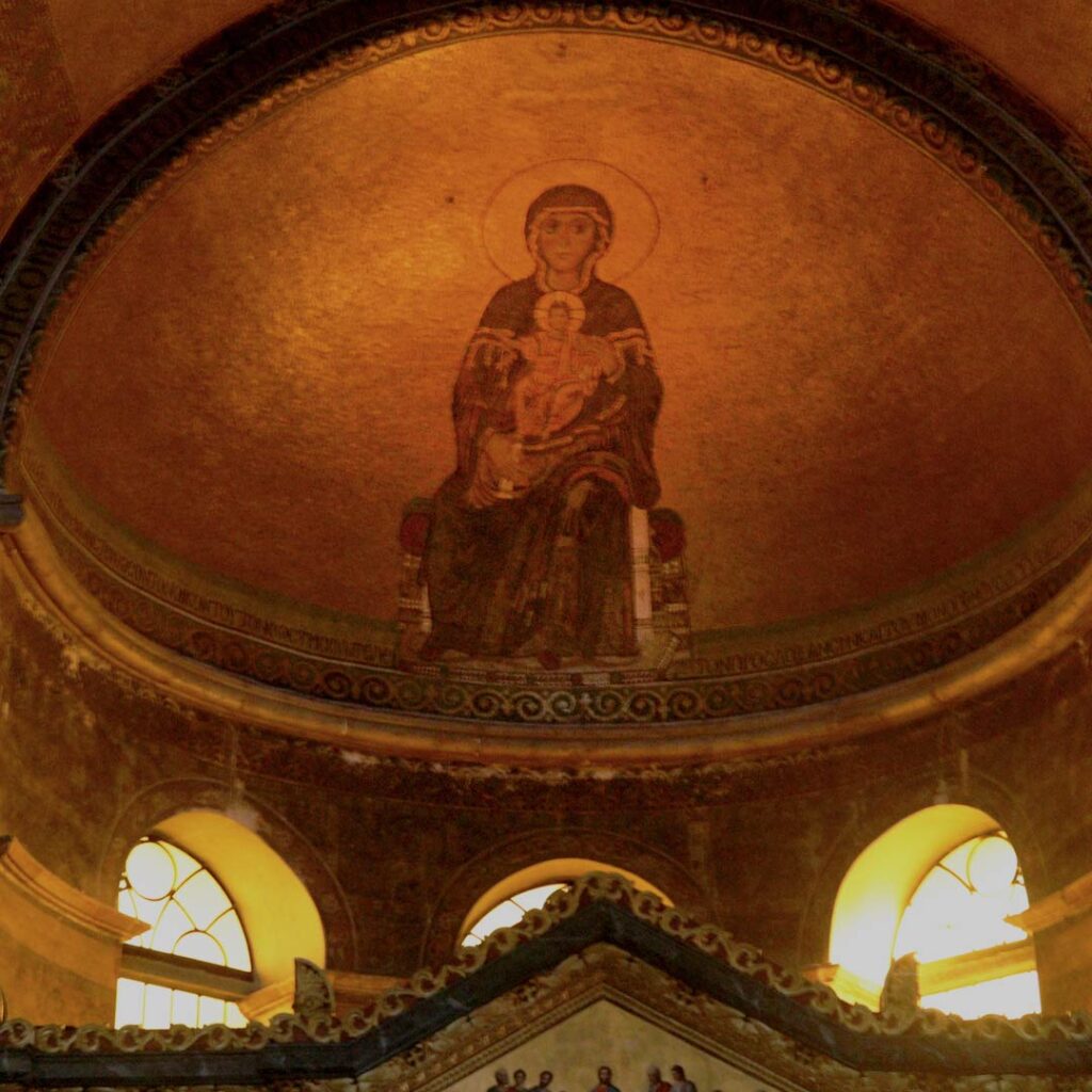 Η μορφή της Θεοτόκου δεσπόζει στην κόγχη του Ιερού, στο πιο ιερό σημείο του ναού. Η θέση της δεν είναι τυχαία· βρίσκεται ανάμεσα στον ουρανό και τη γη, λειτουργώντας ως μεσίτρια. Στη βυζαντινή τέχνη, η Παναγία δεν απεικονίζεται απλώς ως μητέρα, αλλά ως σύμβολο προστασίας και πνευματικής καθοδήγησης.