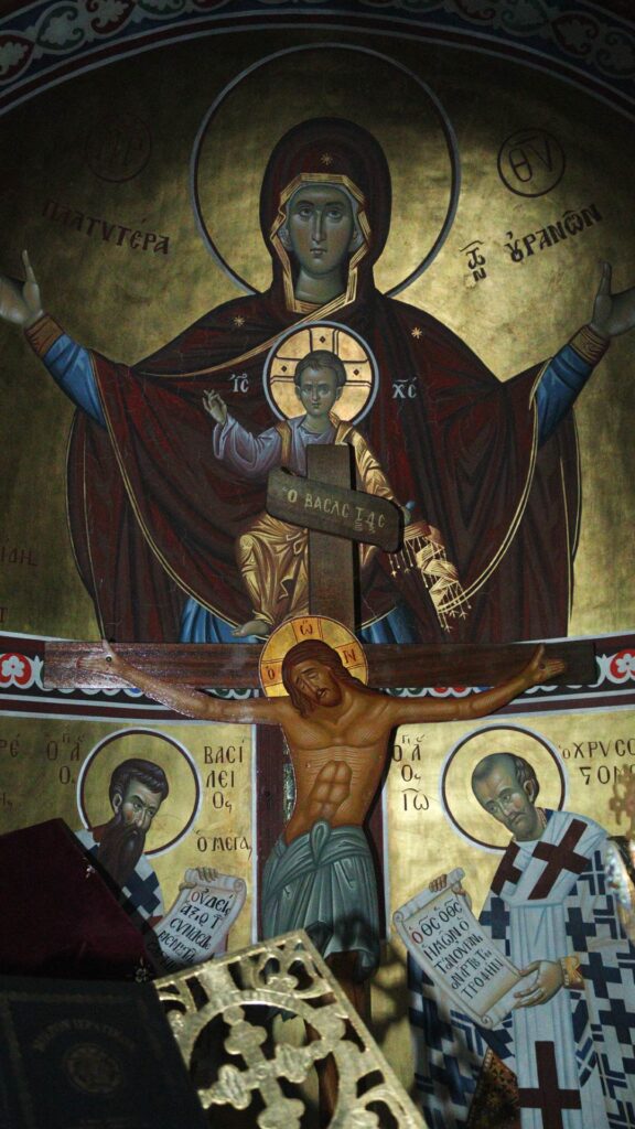 Σύνθεση Σταύρωσης στο Ιερό του ναού, με την Παναγία σε υπερκείμενη θέση. Η κάθετη διάταξη των μορφών και ο σταυρός λειτουργούν ως συμβολικός άξονας που συνδέει το θείο με το ανθρώπινο, παραπέμποντας στο θεολογικό νόημα της θυσίας και της σωτηρίας.
