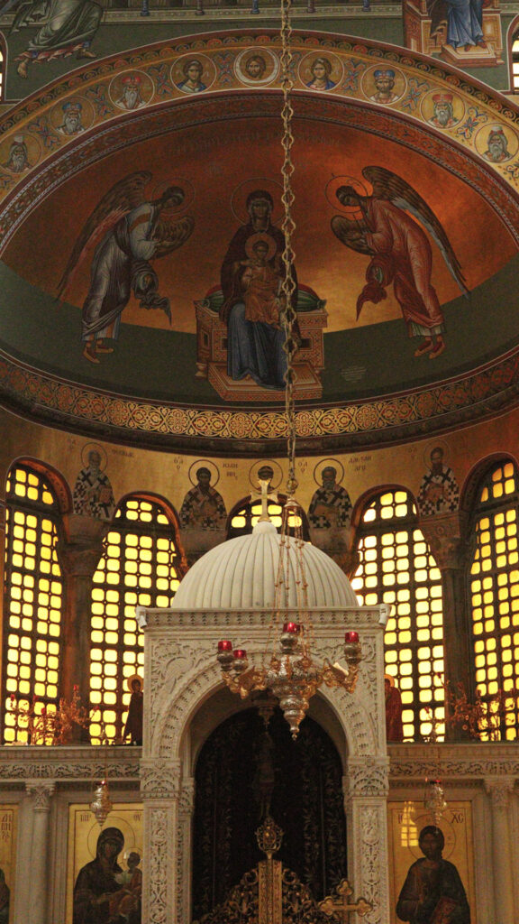 Η Πλατυτέρα των Ουρανών στο τεταρτοσφαίριο της κόγχης του Ιερού. Η θέση της μορφής, ψηλά και κεντρικά, δεν είναι τυχαία· δηλώνει τη μεσιτεία και την παρουσία του θείου στον χώρο της λατρείας, μέσα από αυστηρά καθορισμένους εικονογραφικούς κανόνες.