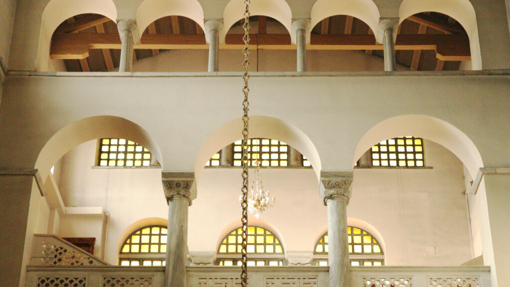 Το εσωτερικό του βυζαντινού ναού ως οργανωμένος συμβολικός χώρος. Οι καμάρες και οι κίονες ορίζουν ρυθμό και ιεραρχία, ενώ το φυσικό φως που εισέρχεται από τα ανοίγματα διαχέεται ελεγχόμενα, ενισχύοντας την αίσθηση μετάβασης από το κοσμικό στο πνευματικό. Η αρχιτεκτονική δεν λειτουργεί απλώς ως δομή, αλλά ως φορέας θεολογικού νοήματος που καθοδηγεί το βλέμμα και τη στάση του πιστού.